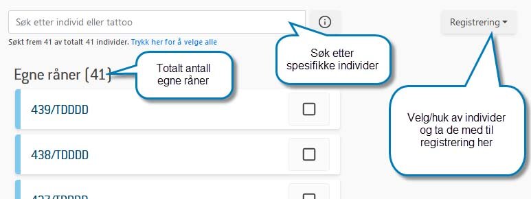 Du kan velge enkelte råner ved å huke av boksen(e) ved individnumrene eller alle rånene ved å huke av boksen ved kategoritittelen Egne råner. Deretter kan du ta med disse individene videre for registrering.