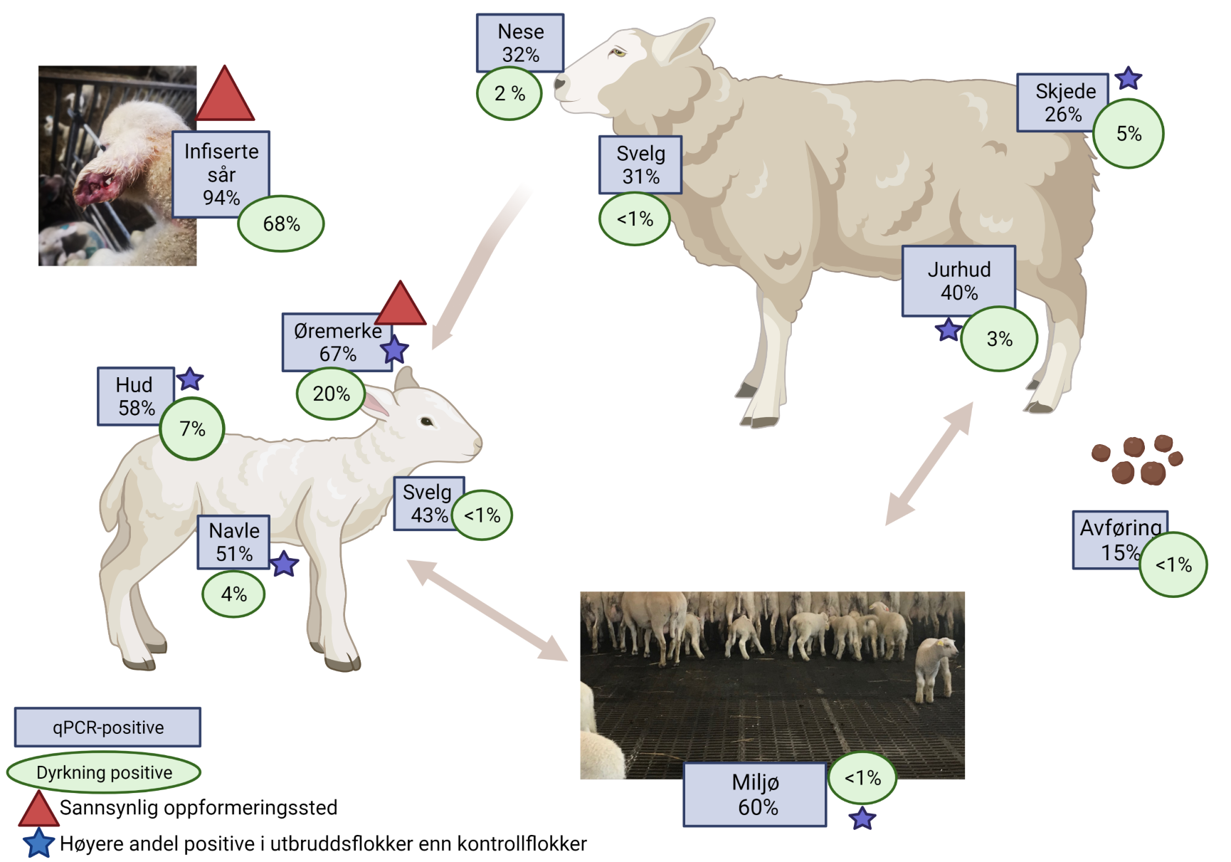 Figur 1: Reservoar og smittekilder til Streptococcus dysgalactiae i sauebesetninger. Tallene er basert på ca. 2000 prøver fra 30 sauebesetninger, hvorav 11 hadde utbrudd av leddbetennelse. qPCR-positive: Vi har påvist arvestoff fra bakterien; dyrkning: Vi har påvist levende bakterier. Figuren er laget med Biorender.com