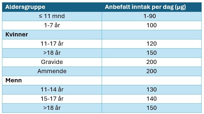 Jod bidrar til produksjon av hormoner som er viktige for blant annet regulering av stoffskiftet, vekst, kroppstemperatur og normal utvikling hos barn og voksne. Det er helt nødvendig å få i seg nok jod under svangerskapet og ikke minst tidlig i barndommen slik at utviklingen går som normalt. Kroppen trenger bare små mengder jod (se faktaboks). Allikevel er det enkelte grupper i befolkningen som ikke får i seg nok eller er i risiko for det. Det gjelder særlig barn, unge, gravide og ammende. Det henger tett sammen med at inntaket av viktige kilder til jod - fisk, melk og meieriprodukter, har gått ned over tid. Selv om kroppen ikke kan lagre store mengder jod, kan også for høyt inntak over tid være uheldig for helsa. Derfor er det viktig å være klar over at enkelte produkter av tang og tare eller andre kosttilskudd kan inneholde mye jod.