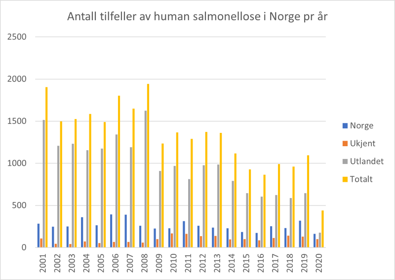 Tallene fra MSIS for 2020 viser en drastisk nedgang i antall påviste tilfeller av salmonellose i Norge sammenlignet med flere tidligere år. De siste 20 årene har det ikke blitt registrert færre tilfeller av salmonellose i Norge enn i 2020. Covid19-pandemien har redusert reiseaktiviteten til utlandet og dermed også grensehandelen. Statistikken viser også betydningen av utenlandssmitte på antall pasienter antatt smittet i Norge. Økt håndvask og desinfeksjon virker også inn på spisehygienen. Det kan også ha sammenheng med mindre sekundær smitte for eksempel til familiemedlemmer eller at forurensede produkter fra utlandet er spist i Norge og dermed regnes som innenlands-smitte.