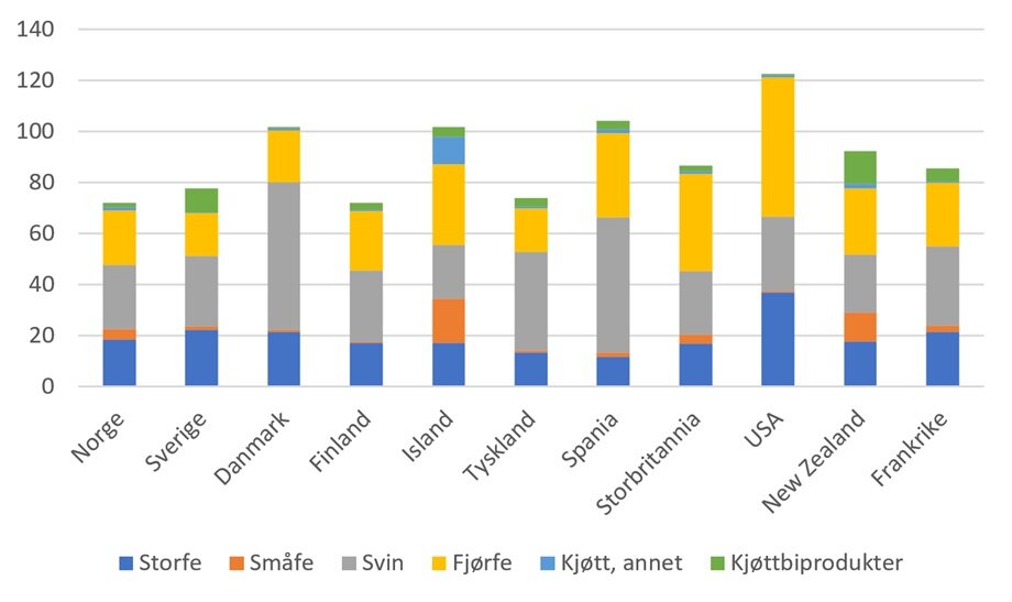 I et nordisk perspektiv viser FAO-statistikken at Norge og Finland hadde det laveste kjøttforbruket, med rundt 72 kg per person per år i 2023 (figur). Høyest lå Danmark og Island med 101,7 kg. Det er forbruket av svin som skiller kjøttforbruket i Danmark fra forbruket i Norge. Forbruket av småfe er derimot høyere i Norge. På Island er særlig forbruket av småfe betydelig høyere enn i Norge, men også fjørfe godt over det norske forbruket av fjørfe.